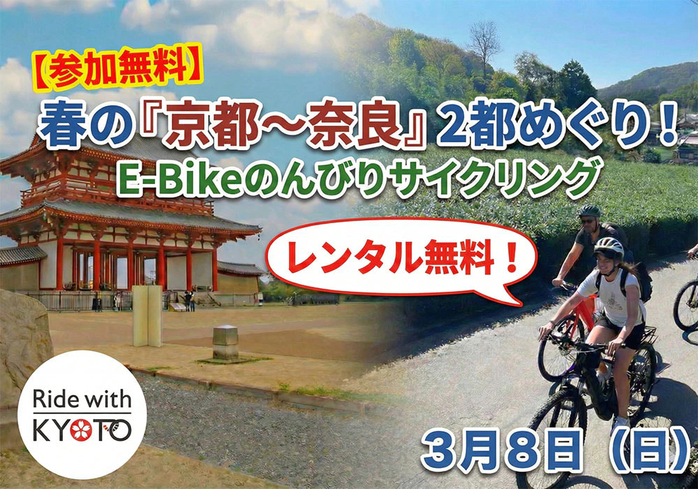 3月8日(日)、春の風を感じながら、京都から奈良へ向かって、自転車で小さな旅に出てみませんか? 話題の最新「E-Bike(電動アシストスポーツ自転車)」に無料で乗れる、先着30名様限定の特別ワンウェイ(片道)サイクリングイベントを開催します!